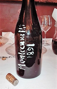 1891 – Castello di Montecavallo La grande ed inaspettata sorpresa, un vino senza tempo, dotato d’una freschezza a dir poco impressionante. Il colore è giallo-aranciato, scarichissimo, ovviamente. Intenso al naso, balsamico, con sentori di fiori secchi e d’agrumi, decisamente elegante. Ma il miracolo si ha alla bocca, che esprime all’inizio un sapore assai piacevole ma quasi indefinibile, con una spiccata vena acida, si colgono poi note d’agrumi, di succo d’arancio soprattutto, di canditi, pare infine che, curiosamente, abbia un certo residuo zuccherino. Un vino emozionante, incredibile pensare che abbia più di centovent’anni.