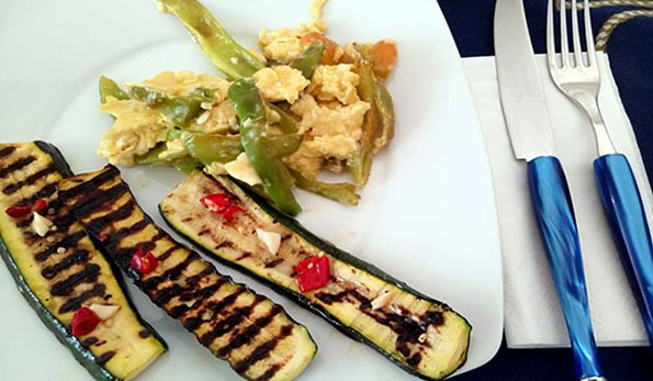 Zucchine grigliate con uova strapazzate ai friggitelli e Trevenezie Sauvignon