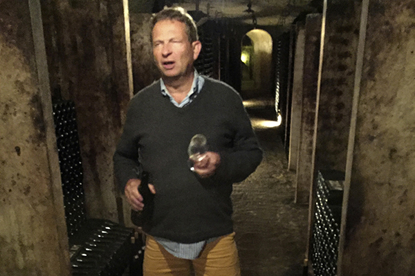 Philippe Foreau è arrivato col suo furgone. Mi ha chiesto se avessi un maglione. Subito non ho capito. Però vedendo che lui si infilava un cardigan, ho preso dalla macchina un giubbino e l’ho seguito. Entrati, un altro portone, e poi, di là, le gallerie, scavate nella roccia, e il freddo. Ci sono 14 gradi naturali, estate e inverno, là dentro. Naturali, ribadisco. Bastano due portoni di legno a far da isolamento. C’è poi un’umidità enorme (mi pare mia abbia detto che arriva intorno al 95%), perfetta per conservare il vino, terribile per le etichette, invece. Tant’è che lì dentro, in quel caveau, le bottiglie non sono etichettate. L’etichetta ce la mettono al momento, a mano, prima della spedizione.