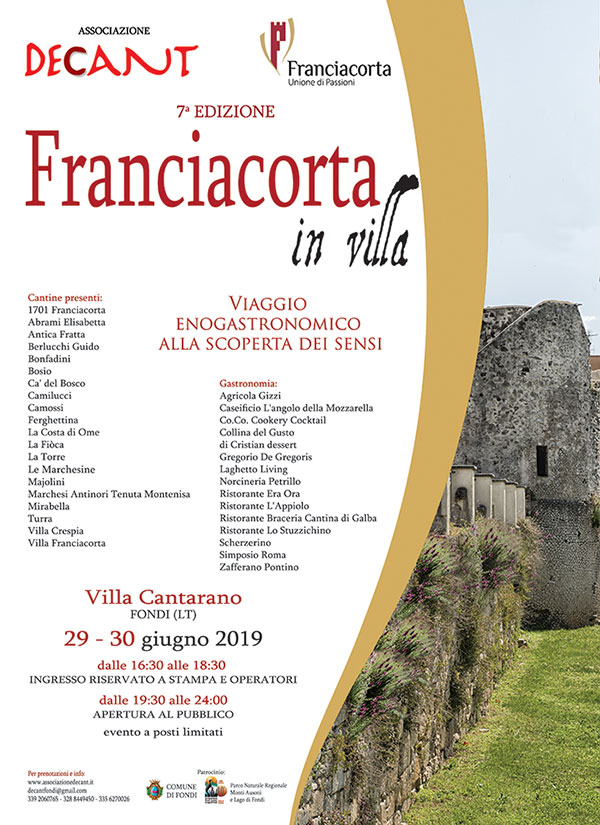 Quando una manifestazione funziona, aumentano coloro che vogliono partecipare, del resto Franciacorta in Villa, ideato dall’Associazione Decant, ha superato da tempo il rodaggio, è giunta alla VII edizione e ancora una volta si svolgerà sabato 29 e domenica 30 giugno 2019 nella splendida Villa Camillo Cantarano di Fondi (LT), inaugurata nel 2007 sui resti di un antico complesso architettonico.