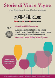 Giovedì 27 Aprile, nell’ambito del ciclo “Storie di Vini e Vigne” ideato da Marina Alaimo per Cap’alice, ci sarà l’occasione di conoscere Graziano Pra che racconterà il suo Amarone della Valpolicella attraverso la verticale delle annate 2006, 2007, 2008 2009, 2010, 2011.
