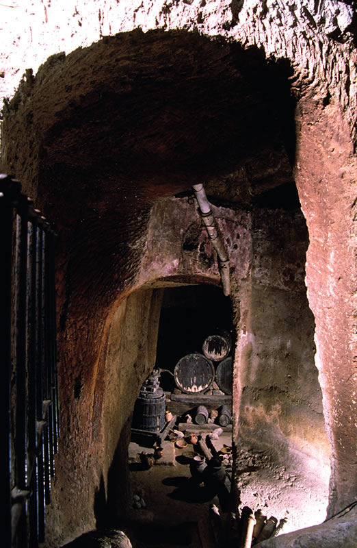 Praticamente intatta e ancora utilizzata dal piccolo ristorante annesso alle grotte, è la cantina medievale, la cui scala di accesso presenta i tipici “scendibotte” (foto sotto), ovvero degli scivoli scavati nel tufo che consentono di far rotolare le botti fino al secondo piano sotterraneo.