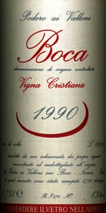 Tre anni di maturazione in botti di rovere e un anno in bottiglia, prima di mettere in commercio il Boca Vigna Cristiana, ottenuto da uve allevate con metodo biologico. La versione 1990, che nel 1998 ha vinto il diploma di merito al concorso Douja d’Or, si presenta di un colore granato molto bello e “classico”, con unghia tendente all’aranciato. Il bouquet è complesso e di buona finezza, pervaso inizialmente da leggeri sentori animali e di cuoio, si apre poi a note di fiori passiti, bacche, ciliegie e amarene in confettura, sottobosco, liquirizia dolce, ginepro, cannella e toni balsamici. Al palato ha un bell’impatto, tannino ancora nervoso, frutto morbido e un’alcolicità appena fuori registro, ma la trama è suggestiva e profonda, sorretta da ottima vena acida e da una sottile sapidità, con un finale che cresce e non sembra arrestarsi, lasciando una sensazione generale molto piacevole e suggestiva. Vino che ha davanti ancora un lungo cammino.