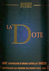 Molto interessante, il bianco La Dote 2001 dell’azienda Punset che, oltre a seguire con attenzione i criteri di allevamento biologico della vite, ha il merito di proporre una gamma di vini storici della zona, come il Barbaresco, il Dolcetto d’Alba e la Barbera d’Alba per citarne alcuni, e alcuni più “sperimentali”, senza mai dimenticare i principi della tradizione, la priorità delle origini rispetto all’omologazione del gusto.